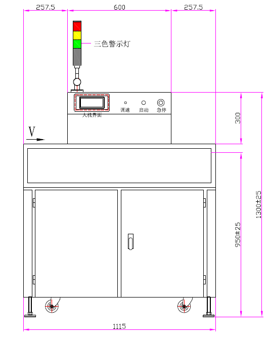 本機采用韓國進口395nm高能LED燈珠,燈面尺寸750mm,采用超短滾筒式光源布局與不銹鋼滾筒輸送,入口高度50mm,輸送方向左→右,速度可無級調節0–7m/min;人機界面為觸摸屏控制,燈組可手動高低升降以適配不同工件厚度。